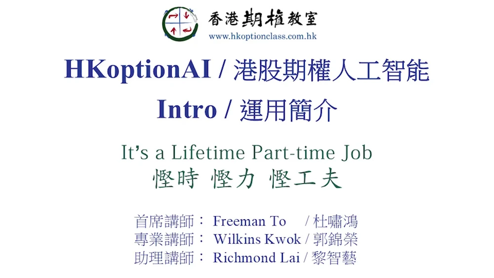 關於HKoptionAI Intro / 港股期權人工智能 運用簡介 網上課程 錄影日期:2025-07-05 單堂 / 全長約1.5小時 e-Learning 收費: 交銀客戶 $200 教室學員 $300 其他 $400 已訂閱用戶可以免費參加。 未訂閱用戶上課後獲贈一個月試用期。 溫馨提示:一周內(7天)可多次重溫,建議把握時間收看。 付款後請將入數紙/截圖WhatsApp至 5322-0580 黎智藝 Richmond 收看